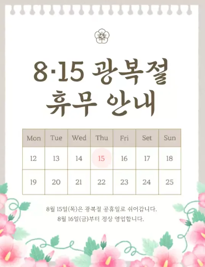이번주 8월 15일(목)은 광복절 휴일이므로 특송접수는 하지 않습니다