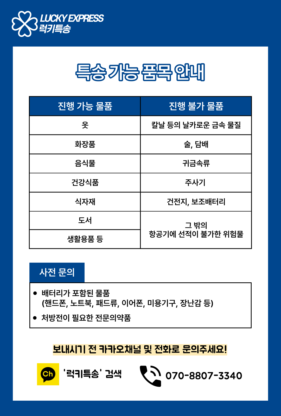 - 진행 불가 : 담배, 술, 스프레이 류, 그 밖의 항공기에 선적에 불가한 위험물